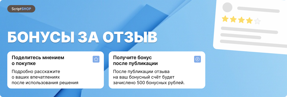 - Получить выгоду. 500 рублей — это ощутимая скидка на следующее решение. Купил несколько скриптов? Пиши отзыв и получай по 500 рублей за каждый!